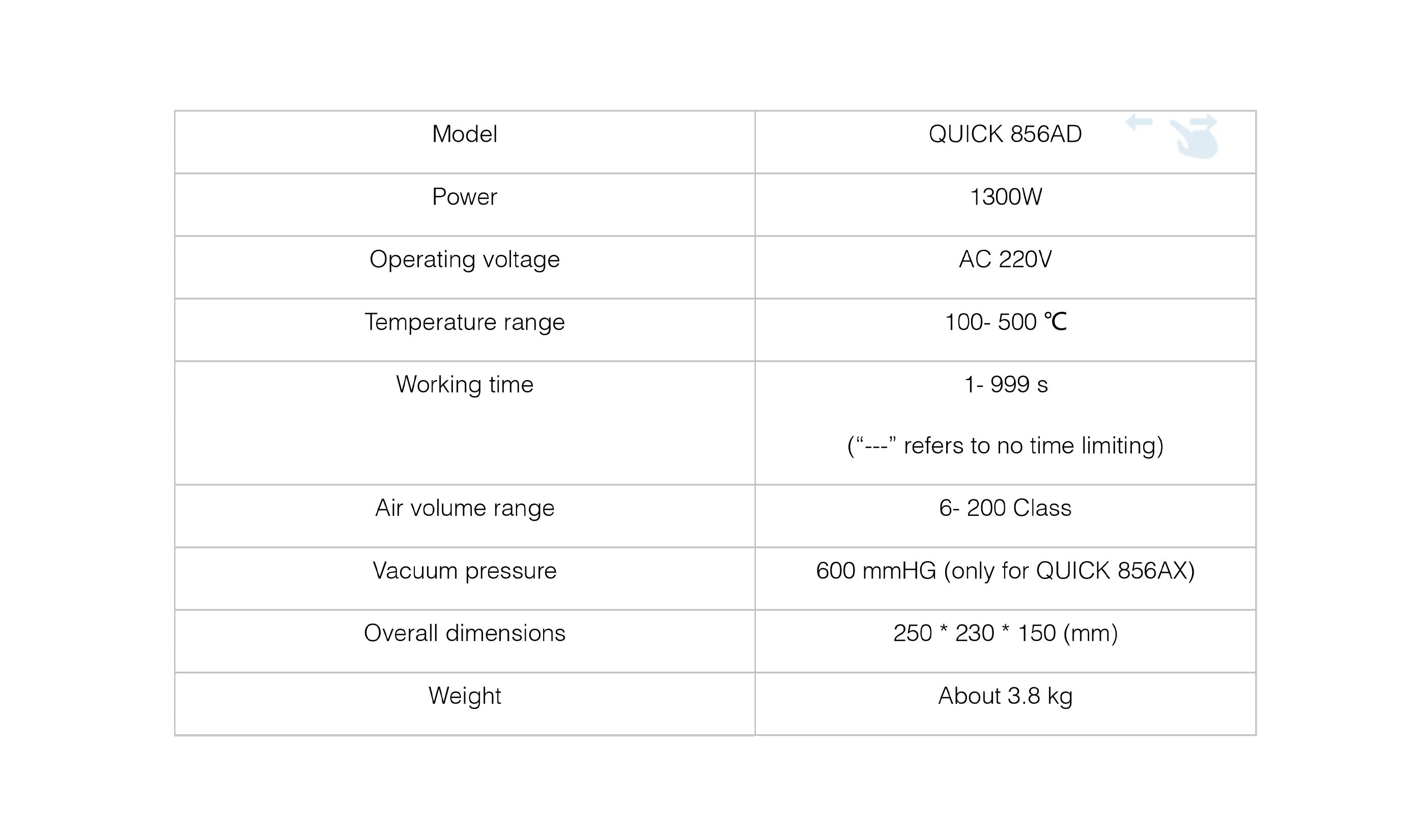 - Closed loop sensor, temperature controlled by micro-computer zero trigger, large power, rapid temperature rising, temperature can be easily and accurately adjusted, not affected by airflow.